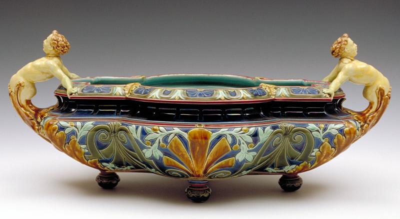 Objet No : 1038 JardinièreExiste en : Majolique Couleurs : polychromePate : majoliqueDates : ± 1880Description : jardinière sur pieds. style néo-renaissance
