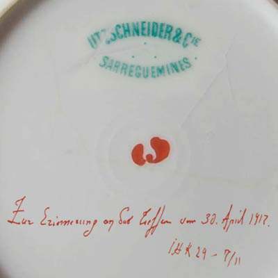 C'est ici que se place l'histoire de notre assiette, le quartier général du 17e "Chevaux légers" était à Sarreguemines et c'est là que Lénine et ses compagnons de route ont été amenés pour y être mis en détention et être interrogés. Dès que la décision de l'Empereur d'aider le groupe à rejoindre la Russie parvient au régiment de cavalerie, la situation des captifs s'améliore considérablement et si pour des raisons de sécurité et de confidentialité ils ne peuvent "s'afficher en ville", ils recevront des visites de sympathisants de l'internationale ouvrière renseignés par un officier allemand, membre du SPD et qui désapprouve le comportement de son parti dans la gestion du conflit.