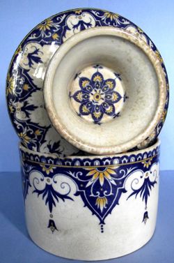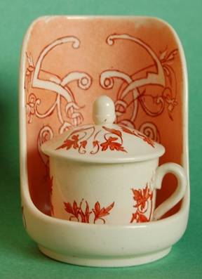 Beaucoup plus rares, des tasses et leurs soucoupes. Celle que nous présentons ici est de forme boule et porte la marque I 36.