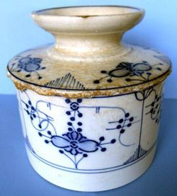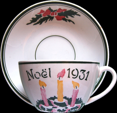 La plus ancienne que nous ayons trouvée est de 1909. Ecrite en allemand, sur une assiette blanche dont l’aile est décorée avec des branches de houx stylisées et posées au tampon.