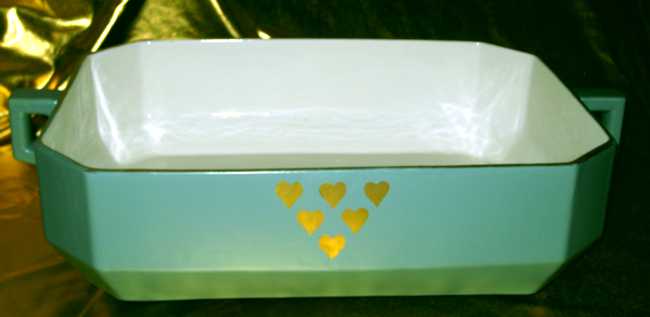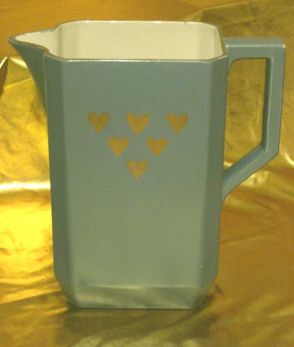 Une pièce banale en soit mais celle-ci nous interpelle par sa forme et son décor. Sa forme était jusqu’alors inconnue des collectionneurs avec qui nous partageons nos connaissances. Son décor est rare, il apparaît sur une page d’un des carnets de G. Herrmann détenu par le musée de Sarreguemines et sur une planche de catalogue où on le voit sur un service à épices " (Les cœurs sont roses sur fond blanc). Il y est dit "Opaque Dekor 3264 rosa" en allemand ou "Opaque décor 3264 rose" en français.