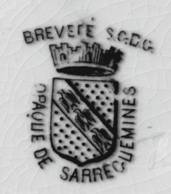 Ce mois-ci, nous nous sommes arrêtés sur une marque qui peut interpeller les collectionneurs débutants ou aguerris. Il s’agit de la marque très connue "opaque de Sarreguemines" répertoriée "I13" dans notre livre Sarreguemines les marques de fabrique mais avec au-dessus une surcharge en arc de cercle : "BREVETE SGDG".Nous connaissions la formulation "terrine breveté SGDG" qui désigne un récipient fabriqué indifféremment à Sarreguemines ou à Digoin destiné à recevoir du foie gras ou des pâtés et dont la forme et le système de fermeture avaient été l’objet d’un dépôt de brevet.