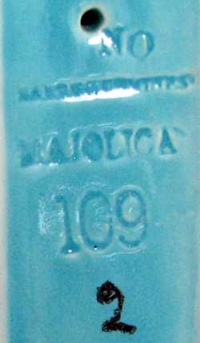 Celui que nous présentons porte la marque C03 (SARREGUEMINES) et C07 (MAJOLICA), ce qui nous confirme être en présence d’un objet fabriqué entre 1865 et 1890.