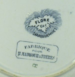Dans le même séjour, la même famille a acheté dans un "souk" local une assiette plate à hors-d'œuvre décor Flore la marque indique une production d'avant 1920. Cette marque est accompagnée d'une seconde qui indique : "Fabriqué pour H. Madkour & frère".