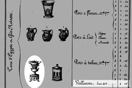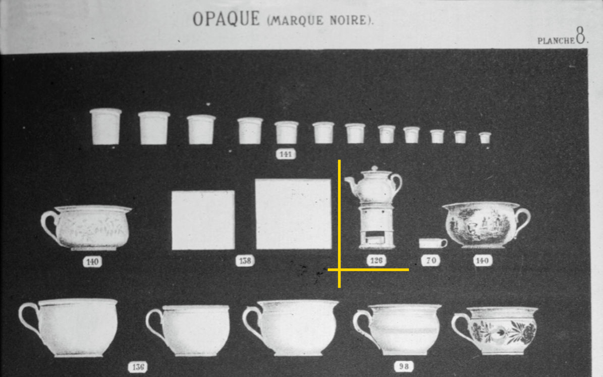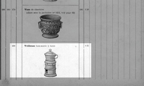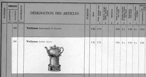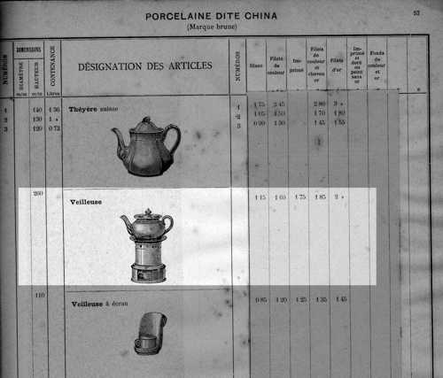 A Sarreguemines, nous avons identifié sur un catalogue de 1840 une tisanière qui est dite "veilleuse Louis XIV". On en rencontre une autre sans dénomination sur une page d'un catalogue édité vers 1875. En 1892 deux exemplaires sont au catalogue : une "veilleuse bain-marie à tasse" de forme "opaque" qui porte un bol couvert et une autre dite "tisanière" de forme "China" identique à celle de notre coup de cœur. Cette dernière apparait également sur le catalogue de 1893.