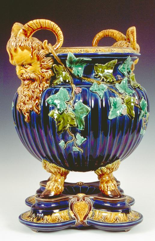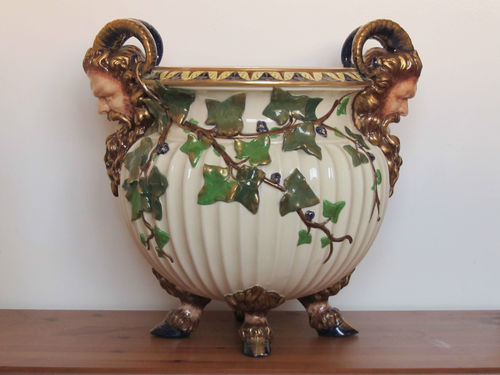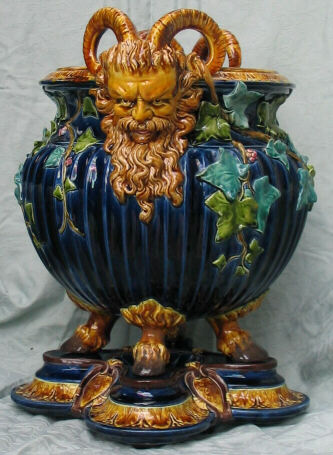 Objet No : 1021 Cache-pot Satyre / Vase SatyreExiste en : Majolique Marques : 1 A et 12Couleurs : polychromePate : majoliqueDates : ± 1880