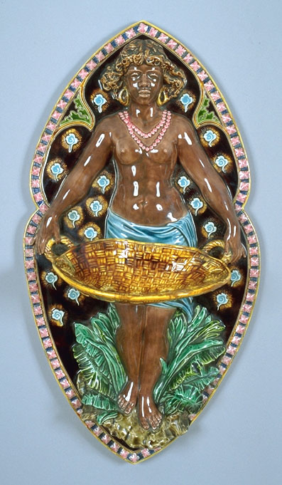 Objet No : 1339 Porte-pipesExiste en : Majolique - LithocérameMarques : 1 ACouleurs : polychromePate : majoliqueDates : ± 1880Description : négresse portant un panier