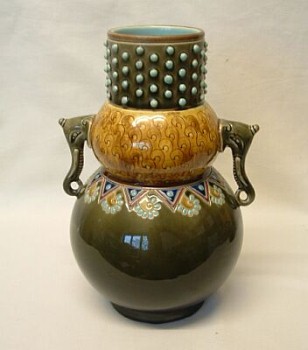 Objet No : 1364 Vase AmamiteExiste en : Majolique Marques : 1 C1 DDécors : 466466Couleurs : polychromepolychromePate : majoliqueDates : ± 1890vers 1890Description : anses en forme de tête d éléphant