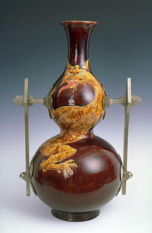 Objet No : 1365 Vase persan avec Dragon Existe en : Majolique Marques : 1 ADécor : Dragon s'enroulant sur la panse.Décors : n° 467Couleurs : brun/marronPate : majoliqueDates : vers 1890