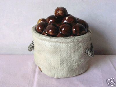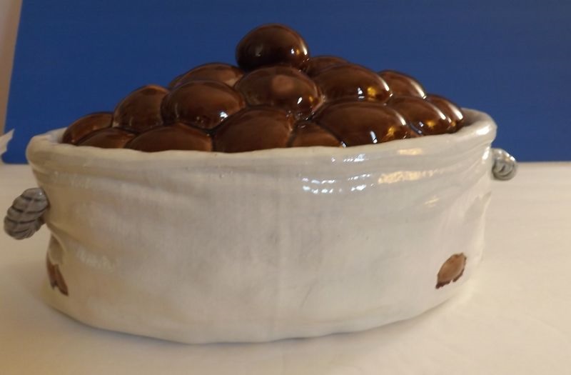 Objet No : 1496 Boîte marrons une livreExiste en : Majolique - LithocérameMarques : 1 ACouleurs : brunPate : majoliqueDates : ± 1900Description : poids : 370 gr