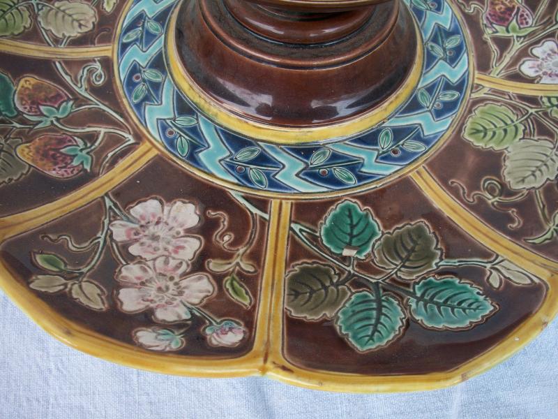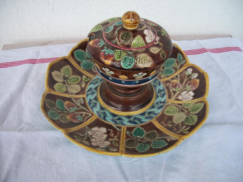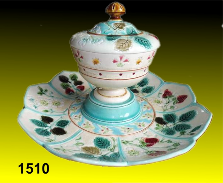 Objet No : 1510 Porte-fraises avec sucrierExiste en : Majolique Marques : 1 BCouleurs : polychromePate : majoliqueDates : 1898Description : Supprimé le 14.3.08