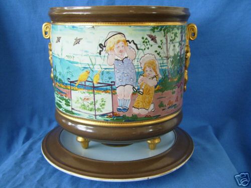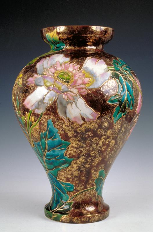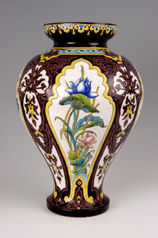 Objet No : 627 Potiche à couvercle et socleExiste en : ChinaMarques : 1 ADécors : émaux cloisonnésCouleurs : polychromePate : majoliqueDates : vers 1880
