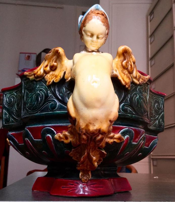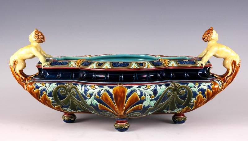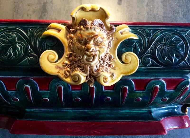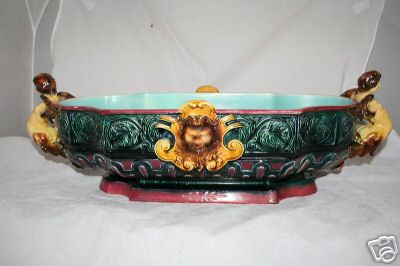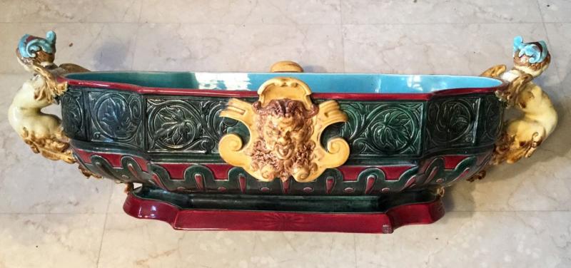 Objet No : 779 Jardinière (découpée et non découpée) Henri IIExiste en : Majolique Marques : 11 et 1 ACouleurs : polychromePate : majoliqueDates : vers 1875